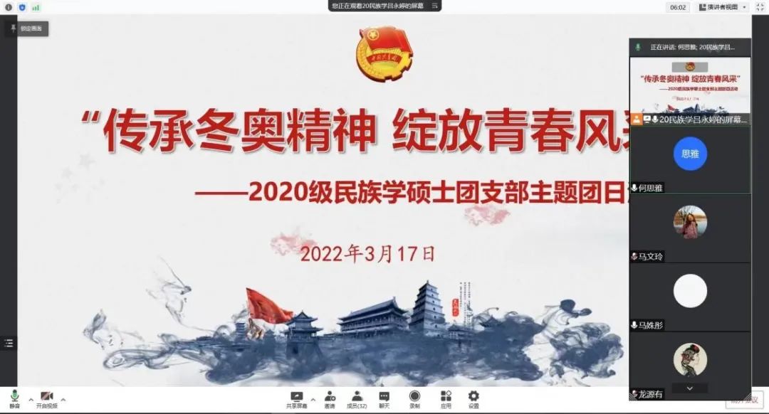 此次团日活动,2020级民族学硕士团支部的青年团员们一同回顾北京冬奥的冰雪激情、志愿激情,是为了在新时代大放青春之光彩,是为了一起向未来!通过冬奥91热爆相关的文章的学习和支部冬奥志愿者的亲身经历分享,团员们纷纷为之感染与动容,两位身边的冬奥志愿者让大家体会到冬奥赛场内外的艰辛付出和无私的志愿奉献精神。