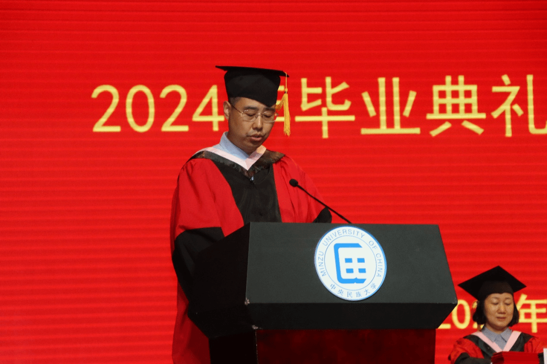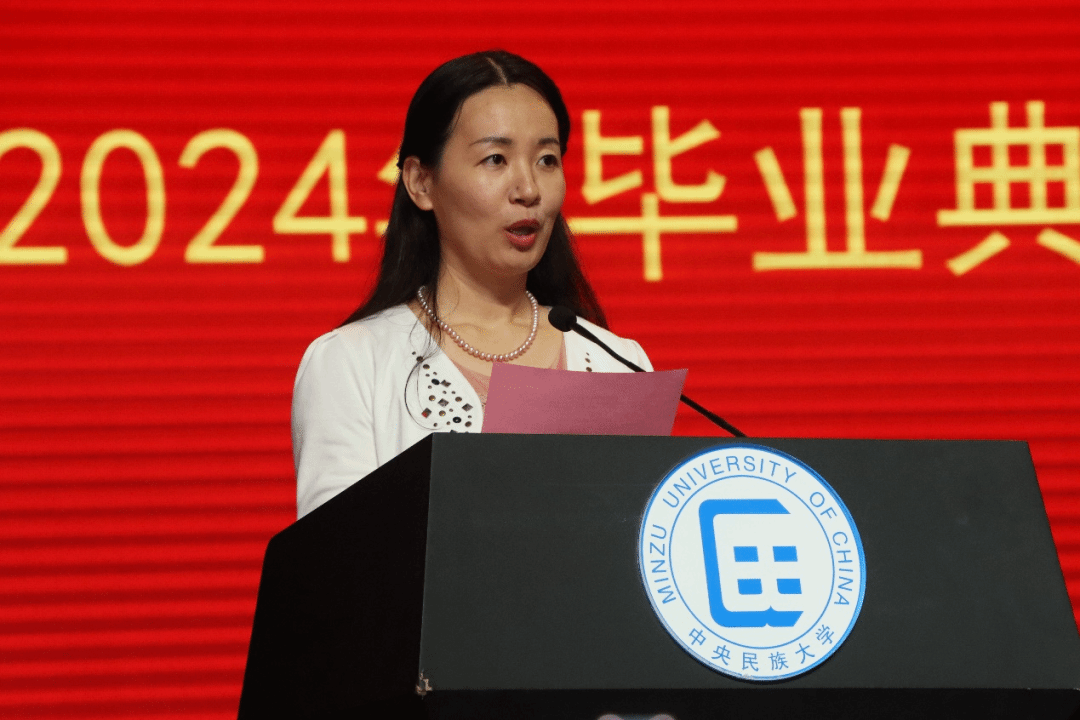 2004级民族学与新闻学双学位本科毕业生,现北京市大兴区委兴丰街道工委副书记、办事处主任段小燕作为院友代表进行了发言。在追忆民社学院求学生活的同时,她分享了个人毕业工作的心路历程,并向全体毕业同学献上了美好的祝愿。她寄语毕业生,一要怀揣热爱、奔赴山海,在平凡中坚守,在坚守中发光发热;二要秉正而立、持善前行,用善良与真诚去面对这个时代,善待自己,善待身边人,也要善待陌生人;三是各美其美、美人之美、美美与共,让拼搏成为日常,让优秀成为习惯,不断超越自我,实现共同进步,努力创造一个和谐、美好的社会。