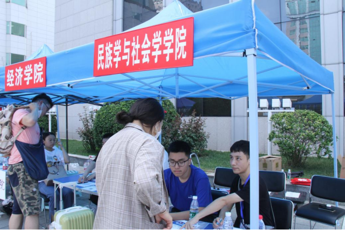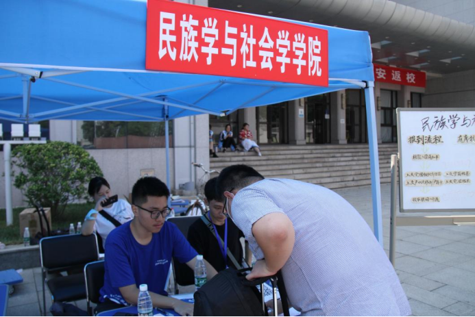 民社院的新同学们陆陆续续的来到迎新展台处进行报到,并领取相应物品。