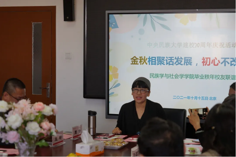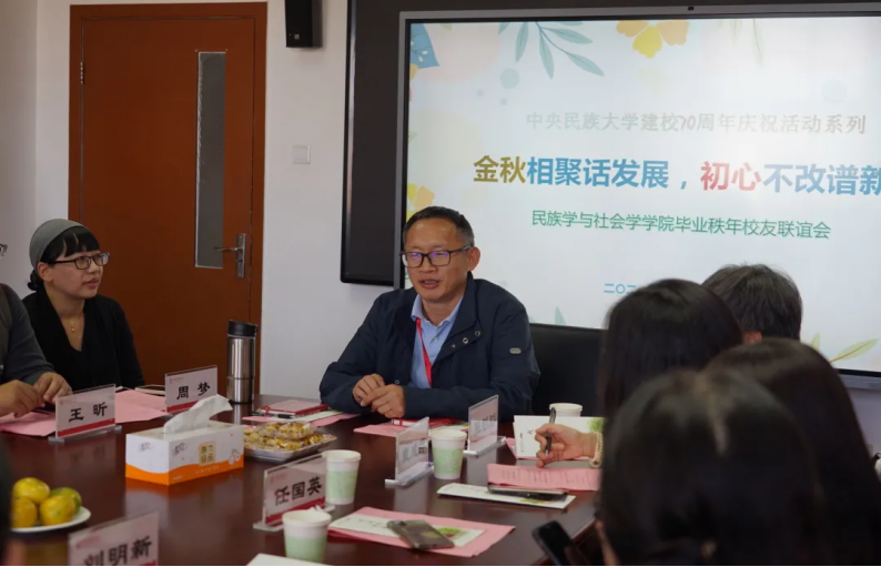 图书馆馆长刘明新、党委书记王洁、副院长罗惠翾、副院长巫达、副院长黄志辉、党委副书记张肜肜也来到联谊会和大家共同庆祝民大七十华诞,欢迎校友们回家。会议由党委书记王洁主持。