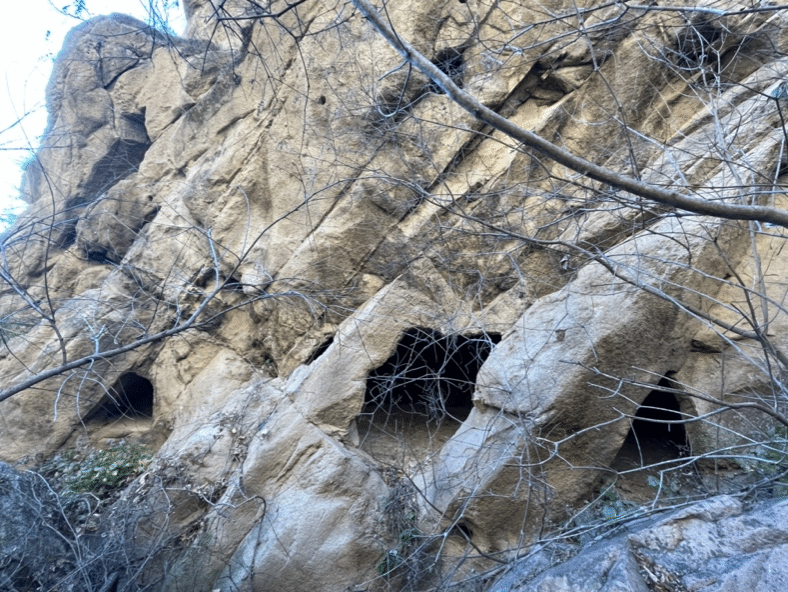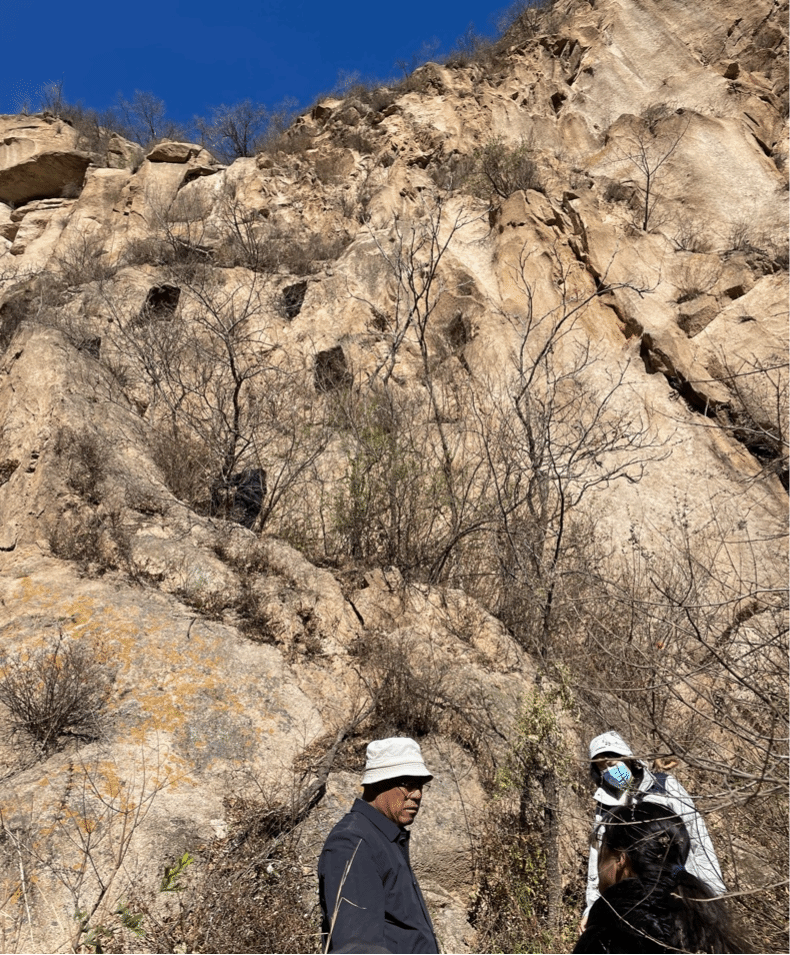 前行约2公里的山间小道后,到了海拔1200余米的顶峰,崖居遗址遥遥可望,南下沟掌,可见西侧“迎客松”下崖壁上的几处石室遗存。
